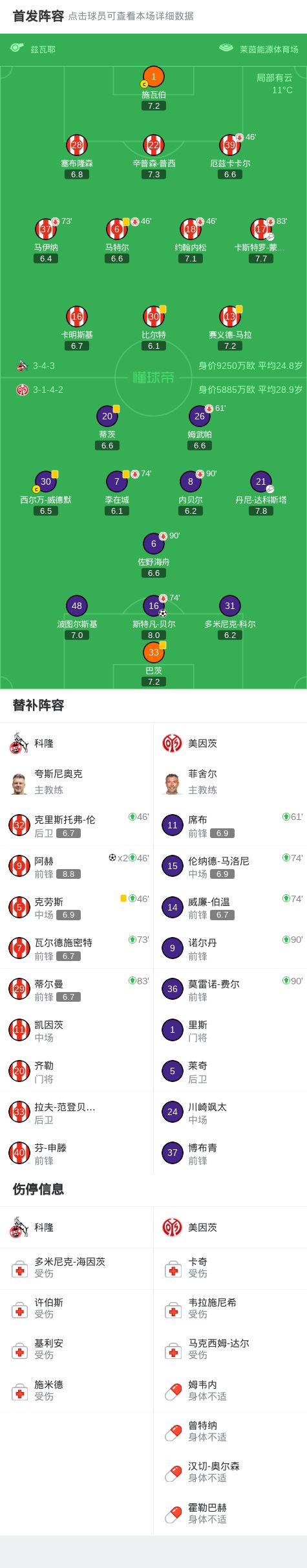 北京时间1月17日德国足球顶级联赛 联赛 第18轮,科隆主场对阵美因茨。科隆阿赫梅开二度。美因茨斯特凡-贝尔破门。最终比分科隆 2-1 美因茨。精彩瞬间第29分钟,美因茨球员丹尼-达科斯塔助攻斯特凡-贝尔打入一球。第57分钟,科隆球员卡斯特罗-蒙泰斯助攻阿赫打入一球。第85分钟,科隆球员阿赫打入一球。球队阵容技术统计